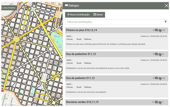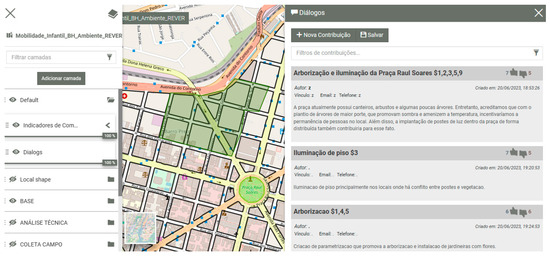 All technical mappings and those captured by voluntary contribution were organized to form the geodesign platform, in which the participants completed the steps of understanding the study area and collectively building and negotiating proposals to improve the area to adapt it for children’s use. In this sense, the definition of geodesign by Miller [9] and Steinitz [10] was proven when they stated that the principle is planning “with” and “for” geography.