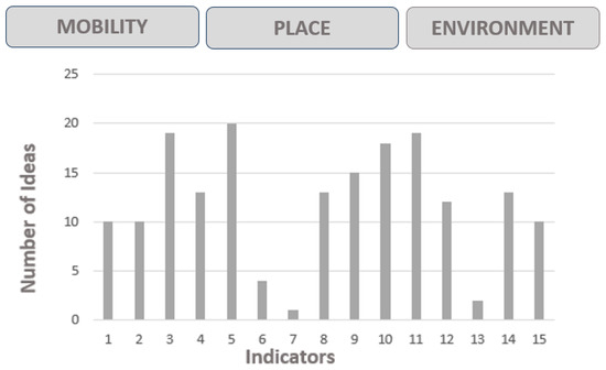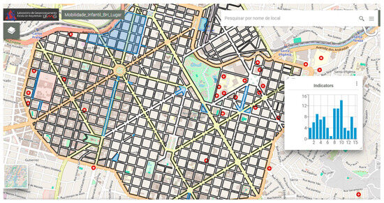 As the ideas were being created, a widget displayed the histogram of the distribution of the number of ideas associated with the completeness indicators. The widget results from the application’s ability to work with the WPS (web processing service) feature, a dynamic mapping layer that updates the results as new records are saved. With this, it is possible to verify the fulfilment of established goals (Figure 23, Figure 24 and Figure 25). Finally, a summary of the sum of the contemplated indicators is presented in a general histogram so that, in the proposal review stage, the participants can try to adjust the lack of the inclusion of some of the expected values, such as, in the example, the fact that they did not pay much attention to indicators 7, 13, and 6 (mixed-use; favorable sidewalk width; active façade, preferably with small businesses) (Figure 26).