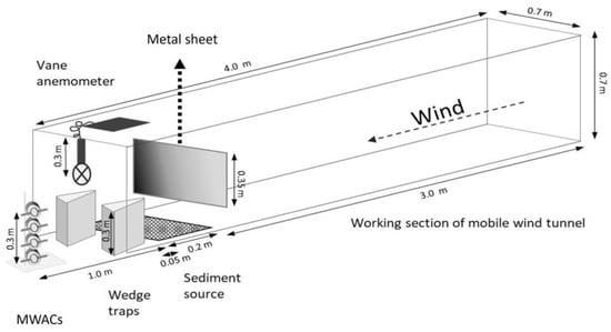 The test setup was included in the working section of the Trier mobile wind tunnel (Figure 1). The Trier mobile wind tunnel has been used in a range of environments to study and compare erodibility on site [30,31,32]. The air stream was generated by a rotor-type fan led through a 4.00 m long transition section and through a honeycomb to generate a quasi-laminar air stream. The relatively stable air stream included a logarithmic wind-velocity profile up to 0.15 m height [33,34]. The experimental setup’s physical limitations concerning reliability, validity, and upscaling of the experimental setup and the adequate application of experimentally derived results were addressed in [35,36].