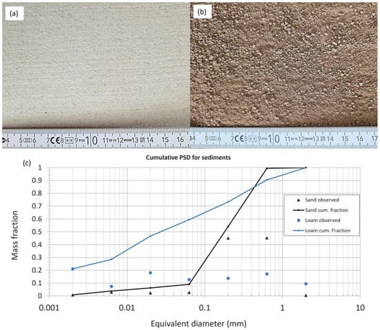 Characteristics of sediments: (a) sand, (b) loam, (c) cumulative particle size distribution.