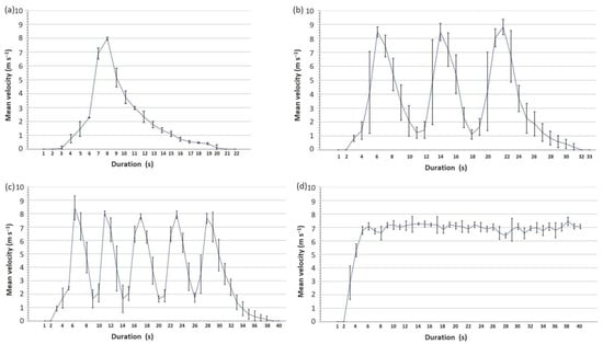 Considering gust generation, the setup was able to produce a faster velocity increase than solely the turning on and off of the motor could create. The peak velocity stayed the same for no gust and one gust (Umax 7.5 and 7.8 m s−1); thus, these tests only differed in their change in velocity. Gusts could be applied quite regularly despite slight rhythm changes. Maximum and minimum velocities changed slightly within as well as between the sequence groups (Figure 3). For one gust, the duration of the actual gust was 1–3 s while the fan needed some time to really stop. For one, three, and five gusts, the velocity did not reach 0 m s−1 during the gusts, but ca. 1.2 (one and three gusts) and 1.8 m s−1 (five gusts). Duration between gusts (gust duration) decreased from ca. 10 s (one gust) to ca. 7 s (three gusts) to 5.5 s during five gusts.