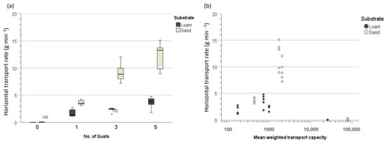 The statistical analyses underline that the characteristics of gusts included here do not comprehensively explain the impact of the respective horizontal transport rates. The most pronounced relative impact was found for one gust on loam. This strongly supply-limited sediment was most effectively entrained by one gust and the accompanying turbulences, whereas a uniform air stream with a higher mean velocity (6.4 and 1.8 m s−1 for no gust and one gust) and a similar peak velocity (7.5 and 7.8 m s−1 for no gust and one gust) was hardly erosive. This may mostly be explained by the fact that the gusts entrained larger aggregates (ca. 50% aggregates > 0.84 mm). Even the consecutive gust sequences (three and five gusts) eroded much more material than a uniform air stream both in total and per minute of test duration (Table 2). This finding may reflect the characteristic impact of a gusty, turbulent air stream that entrains dust most effectively, although the action of this air stream is temporally and spatially very limited [12].