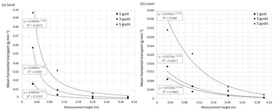 For gust tests, the rates of sediment collected per height decrease with height and increase with increasing number of gusts both on sand and loam (Figure 6). This distribution is clearer in sand than in loam. The highest rates were measured at 0.03 and the lowest rates at 0.30 m. For sand, the distribution for all gusts is described by a power function with R2 =0.98 for one gust, R2 = 0.99 for three gusts, and R2 = 0.96 for five gusts. For loam, exponential distributions fit best with R2 = 0.99 for one gust, R2 = 0.86 for three gusts, and R2 = 0.99 for five gusts. A linear distribution adequately approached the sediment collected from one-gust tests (R2 = 0.92) and three-gust tests (R2 = 0.94) on loam, which indicates a variation from the expected pattern. The vertical distribution of horizontal transport supports an adequate test setup, including data acquisition by the expected decrease in collected sediment with height.