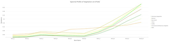 Somewhat expectedly, many of the vegetation classes (i.e., coffee, citrus, banana, palm, and overstory vegetation) were misclassified as other vegetation classes. Because these classes are spectrally similar, and because the initial classifications utilized all 10 bands, including those that had little separation between classes within the same band, it could be anticipated that there would be some confusion amongst these classes. Figure 4 illustrates the spectral similarities across vegetation training classes. Another area of confusion was between the pavement and building classes. Across many of the farms, buildings and pavements were misclassified as one another, but were less often misclassified as bare earth and vegetation.