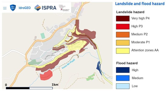 Landslide and flood hazard map of Grotte di Castro from IdroGEO, The Italian web platform on landslides and floods, hazards and risk (ISPRA 2020 Pericolosità e indicatori di rischio per frane e alluvioni) [44]. Attention zones (AAs) indicate the presence of cavity systems.