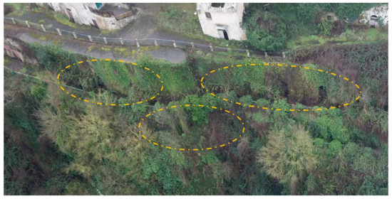 Example of using frontal photos to limit the effects of vegetation. In the orange ovals, some examples of localised entries using frontal photos (inclination of the gimbal 0°–25°).