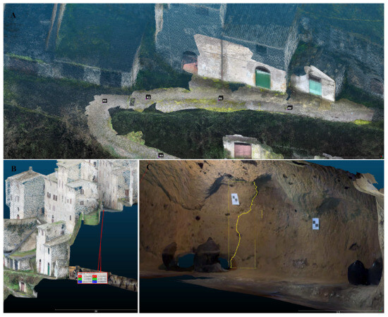Days with good weather conditions and low wind speeds (less than 7 knots) were considered to execute the UAV flights. To limit urban clutter problems, such as vehicular traffic, the flight was performed on public holidays and in the early morning hours (7–9 am). Photogrammetric surveys were carried out using the DJI Mavic Pro UAV equipped with onboard camera. The vehicle’s small size is well suited to urban contexts, simplifying piloting conditions and facilitating surveying patterns. To compensate for the limited characteristics of the onboard camera, the surveying pattern was planned with the camera in a nadiral position (−90°) with an estimated photographic overlap of 80%, at a speed of approximately 3 m/s and at an altitude of 40 m from the take-off point, located on the summit portion of the cliff to avoid reductions in the photographic overlap. The images were also acquired with manual flights, camera in a frontal position (0°–25°) and at a low altitude (25–30 m), frontally framing the built-up area and the neighbouring slopes at an estimated distance of approximately 30–35 m. The low flight speed combined with the optimal lighting conditions related to the time of day helped to limit possible distortion and blurring effects in the photographs. In total, 589 images were taken and stored on a high-speed memory card. To obtain a high-precision survey, nine markers were placed on the ground (Figure 4A), the centre of which was measured with the Leica GNSS station consisting of GS08 plus rover, CS10 controller and 2 m rod, connected to Leica’s Smartenet network. The geographical coordinates obtained (ETRF 2000) were transformed into Monte Mario Italy I (EPSG 3003) projected coordinates using the IGM GK2 grid No. 333, containing the geoid model Italgeo 2005. The photogrammetric process involved the use of AgisoftMetashape Professional software (version 1.6.3 build 10732). First, the quality of the images was assessed using the Metashape tool Estimate Image Quality. The photos obtained had quality values between 0.69 and 1.07. Only images with quality values greater than 0.75 were considered for the survey, which resulted in only four images being eliminated beforehand. Using 585 images, the sparse cloud was created, and the reference system (EPSG 3003) was given, assigning each marker found in the photos the coordinates processed from the GNSS measurements (Figure 4A). The markers were divided into Ground Control Points (GCP) and Control Points (CP) to estimate the errors in the survey. The sparse cloud was first subjected to the alignment optimisation and Gradual Selection process, removing points from the sparse cloud to improve reconstruction uncertainty, projection accuracy and reprojection error. This sequential processing further reduced the error associated with the survey. Following the workflow, the high quality dense cloud was generated, then edited by removing low confidence points and classifying it. From the point cloud, we obtained the texturised 3D model and DEM, with the latter used for the realisation of the orthomosaic. To evaluate a faster and more flexible use of drone photogrammetry, a 3D model, with average quality, was created using data from the Mavic Pro’s onboard GPS in wgs84 geographic coordinates without using GNSS station data. This model was used to identify the cavity entrances quickly. A field survey was then carried out to locate the cavity entrances for comparison.