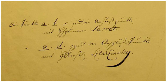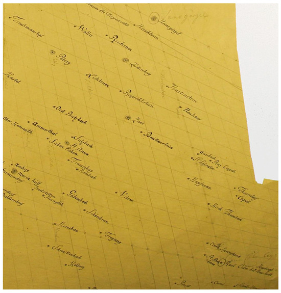 Following Paldus [6], Stigloher mentions that Lieutenant Colonel Staržinsky and Captain Sarret made a survey, but he could not find it [18]. The authors found sketches of this survey in the Vienna War Archives (Figure 3 and Supplementary Materials). The seven survey sketches show a network of points from Frankfurt to Ingolstadt and Regensburg, thus effectively linking the two isolated Cassini networks around Würzburg–Coburg and Bayreuth to the northeast of the Rhine and Danube Cassini chains. The authors did not find any coordinate indexes for the Staržinsky-Sarret sketches, and although the sketches have interesting editing aids and additional information, their interpretation has not been deciphered. Given the fact that Staržinsky’s name appears in the list of officers on the Schmitt’s map as the Quartermaster General Staff (Generalquartiermeisterstab), and that the survey was carried out directly before Schmitt’s map, the authors assume that it was used to produce the latter map.