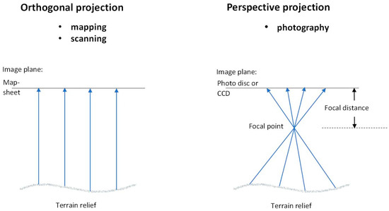 Geometric difference between the orthogonal projection (scanner) and the perspective projection (camera) and the position of the mapped points on the image surface.