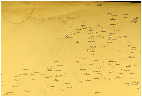 The detail points were plotted ‘à la vue’ on a small scale table between the base points, measured via stepping, or riding, or just estimating. Schäfer [23], referring to Oehme [24], claims that new points were added based on already-known points, and that the use of points fixed earlier (in our context, geodetic frame grid points) can be assumed.