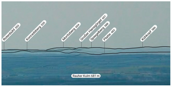 From the Rauher Kulm, many of the points indicated in Figure 5 are visible. This is the view line to the Hansgörgel. Photo by G. Timár, with the skyline provided by the PeakFinder application.