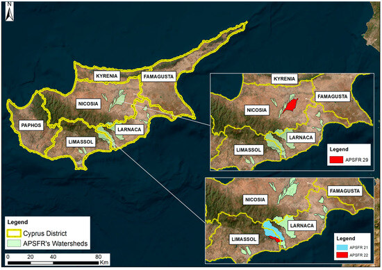 This research’s study area consists of two Areas of Potentially Significant Flood Risk (APSFR), which are specified from the second implementation of the Floods Directive in Cyprus. The abovementioned areas are two river systems, Vasilikos—Asgatas and Vyzakotos—Kalogeros, located in the region of Cyprus (Figure 1).