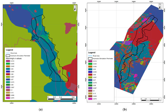 Manning values are inserted in hydraulic models as a shapefile from HEC-RAS Mapper, and same-valued polygons are created, where each of which represents a specific Manning value. Manning values assumed for the purposes of this study are presented in the following Figure 2 for APSFR 21–22 and 29, respectively.