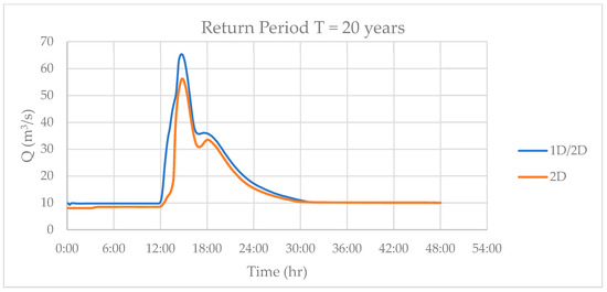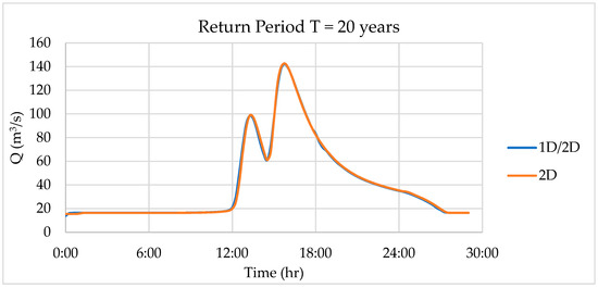 According to Figure 7, in the hydraulic simulation of a 20-year return period event, a notable agreement between the flood peaks of the full 2D and combined 1D/2D model was observed. The 2D simulation produced a flood peak of 56.12 m3/s at 14 h and 45′ from the start of the event, while the combined model indicated a flood peak of 65.31 m3/s at 14 h and 40′. The difference of 14% in flood peaks is deemed reasonable and aligns with the results presented in Table 2, which recorded the largest runoff volume error at 5.2%. This discrepancy can be attributed to the retention of water approximately 580 m upstream of the outlet, which prevents this volume from reaching the outlet. This retention is likely due to the agricultural land in the area, which affects the flow dynamics. Additionally, the accuracy of the calculation and the detailed design of the computational grid, which can be adjusted by the user, contribute to this result.