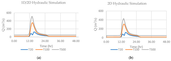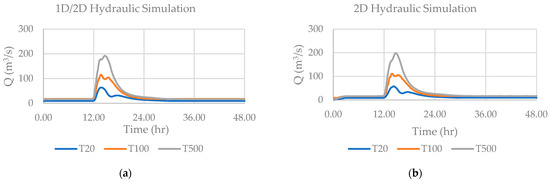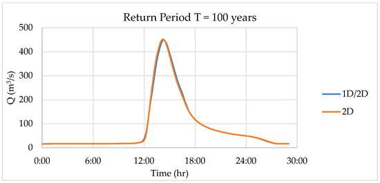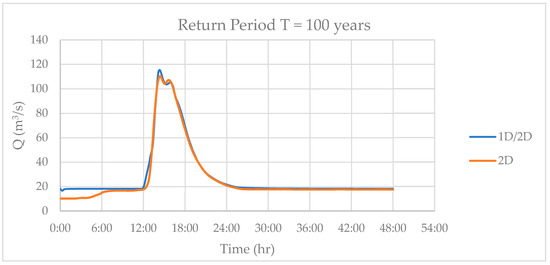 According to Figure 8, in the hydraulic simulation of the 100-year return period, a high match of the flood peak between full 2D and combined 1D/2D flood peaks is observed. The 2D simulation gives a flood peak at 14 h 30′ from the event occurrence and is equal to 110.02 m3/s. The combined one at 14 h 20′ is equal to 115.44 m3/s. Therefore, there is a high convergence between the peak flows and the occurrence of small discrepancies considered non-critical.