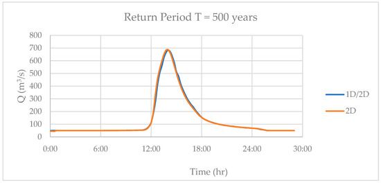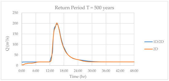 According to Figure 9, in the hydraulic simulation of the 500-year return period, a high correlation between the flood peaks of the full 2D and combined 1D/2D models was observed. The 2D simulation indicated a flood peak of 198.2 m3/s at 15 h and 15 min from the start of the event, while the combined model predicted a flood peak of 196.83 m3/s at 15 h. The close alignment of peak flows, with a negligible time lag, underscores the reliability and accuracy of both modeling approaches.
