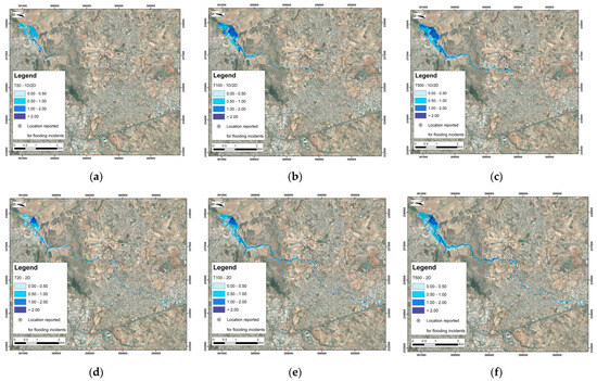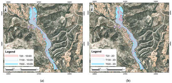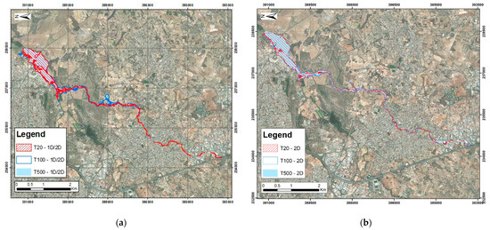 Comparing the inundation area maps produced by the 1D/2D combined hydraulic simulation method and the full 2D method, no notable differences were noticed. The following inundated maps (Figure 11, Figure 12 and Figure 13) present the flooding area in APSFR 21–22 for each return period, T = 20, 100, and 500 years, respectively. These results came into agreement with the hydrographs that are explained in Section 3.1. In smaller flooding areas, greater percentage differences are observed.
