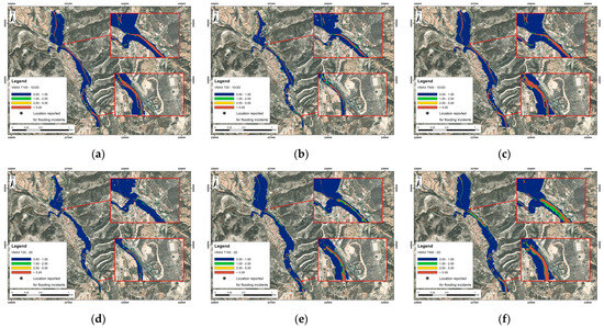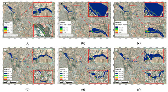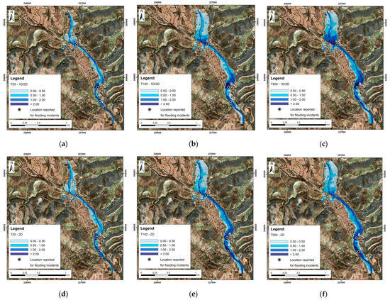 (a) Depth map for T = 20 years for 1D/2D hydraulic simulation, (b) depth map for T = 100 years for 1D/2D hydraulic simulation, (c) depth map for T = 500 years for 1D/2D hydraulic simulation, (d) depth map for T = 20 years for 2D hydraulic simulation, (e) depth map for T = 100 years for 2D hydraulic simulation, (f) depth map for T = 500 years for 2D hydraulic simulation.