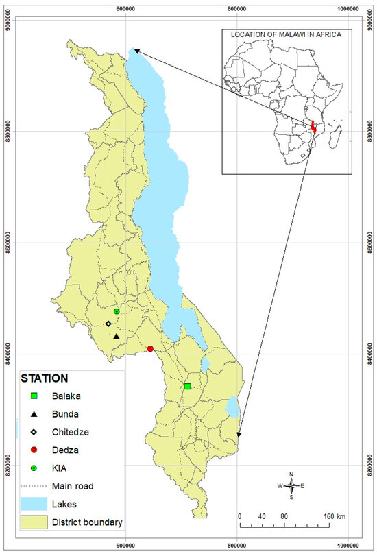 These physiographic features influenced the selection of three major climatological and geographical zones in Malawi, each represented by the meteorological stations listed in Table 1. The mid-altitude zone was represented by the Lilongwe north, central, and south stations, specifically Kamuzu International Airport (KIA), Chitedze Agricultural Research Station (Chitedze), and Bunda College of Agriculture (Bunda), respectively. The high-altitude zone was represented by the reference station at Dedza, while the low-altitude zone was represented by the gauge station at Balaka. The mid-altitude stations are located within the Lilongwe Plain, covering 6.5% of Malawi’s land and ranging between 1000 and 1400 MASL [27]. Dedza, at the base of Central Malawi’s highest point—the 2200-MASL Dedza Highlands—experiences significant climatic influences from both the highlands and Lake Malawi. Balaka, in southern Malawi, spans 2.5% of the national territory on lowland plains and isolated hills, with elevations from 350 to 800 MASL. The locations of these stations are depicted in Figure 1.