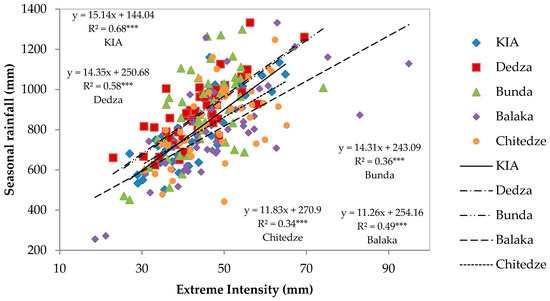 Regression analysis results for seasonal rainfall against extreme intensity. R2 values: *** significant at α = 0.001.