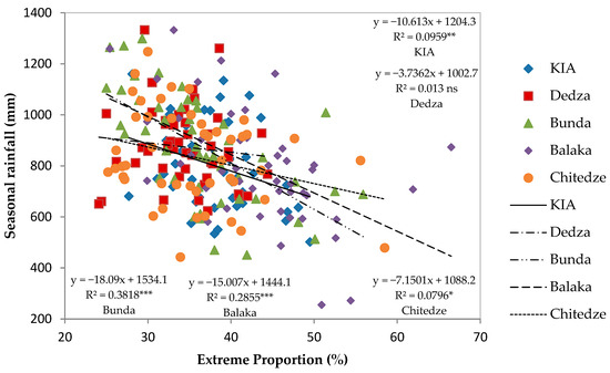 Regression analysis test results for seasonal rainfall against extreme proportion. R2 values: ns = not significant, * significant at α = 0.10, ** significant at α = 0.05, *** significant at α = 0.001.