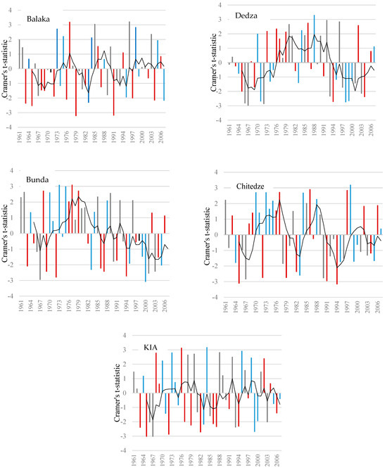 Inter-seasonal rainfall departures obtained using Cramer’s trend test are shown in Figure 4. Among the total instances of above-normal departures at Balaka, Dedza, Bunda, Chitedze, and KIA, 38.1%, 52.6%, 63.6%, 50%, and 57.1%, respectively, were found to be significant (tk = 2.021 (45df), α = 0.05). In contrast, below-normal deviations were significant in 32%, 41.7%, 52.2%, 37.5%, and 53.8% of cases for the respective series shown in Figure 4; Balaka exhibited the fewest overall departures. There were clearly defined periods of above- and below-normal rainfall, as seen by the 5-year running mean of rainfall departures for Balaka, Chitedze, and KIA. While KIA leaned near the mean, Chitedze had noticeably higher deviation values. Rainfall departures for the Dedza and Bunda series showed synchronous variations, with one above-normal period followed by lower departures. Multi-decadal periods of above-normal deviations were evident in the Dedza series between 1976 and 1993 and in the Bunda series between 1971 and 1985.