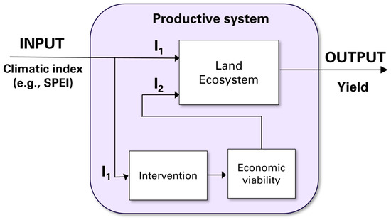In the present study, we carried out a statistical analysis involving grape yield and climatic time series to identify changes in the sensitivity of the agricultural production system to climate variability over time. In studying the response of the crop production system to climate fluctuations, it is important to consider that the system is characterized by a complex interplay of ecosystem, technical, and engineering solutions, and economic variables (Figure 1). In the event of unfavorable climatic conditions, a series of technical solutions (e.g., irrigation, frost protection, etc.) may be implemented to mitigate the negative effects and optimize yield, albeit at a cost. However, these technologies may not always be sufficient to achieve desired crop yield targets, and their use depends on an economic viability assessment. The crop production system can be viewed as a dynamic system, including three sub-systems (Figure 1): (i) land ecosystem (LE), (ii) interventions (INT) and (iii) economic viability condition (EC). The input is a climatic variable, described by an opportune index, which provides the input I1, and the output is the crop yield value. I1 is the input for the sub-systems LE and INT. The EC sub-system produces a second input (I2) for LE, which is intentionally anticorrelated with I1, in order to minimize the effects of unfavorable climatic conditions and optimize the output.