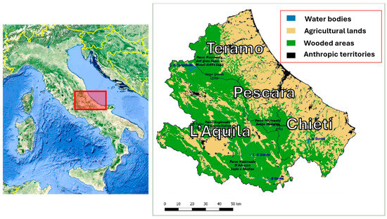 The study area includes the four provinces of the Abruzzo region, which cover approximately 11,000 km2 in central Italy (Figure 2). This region is characterized by a Mediterranean climate with a marked areal variability, due to its complex geomorphological settings.