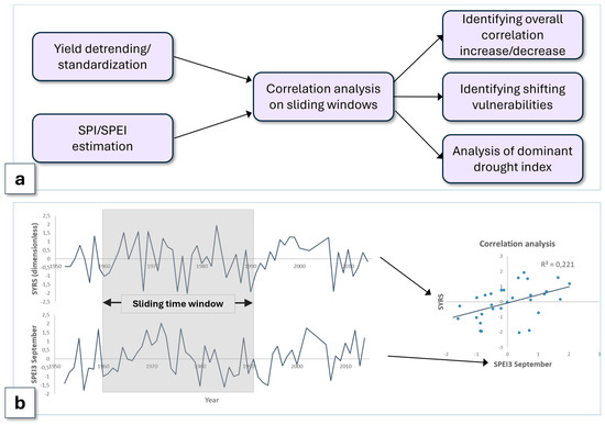 (a) Flowchart summarizing the analysis process. (b) Example of correlation analysis between SYRS and quarterly SPEI (SPEI3) of September, for grape in the Chieti province, over the time range 1960–1990.