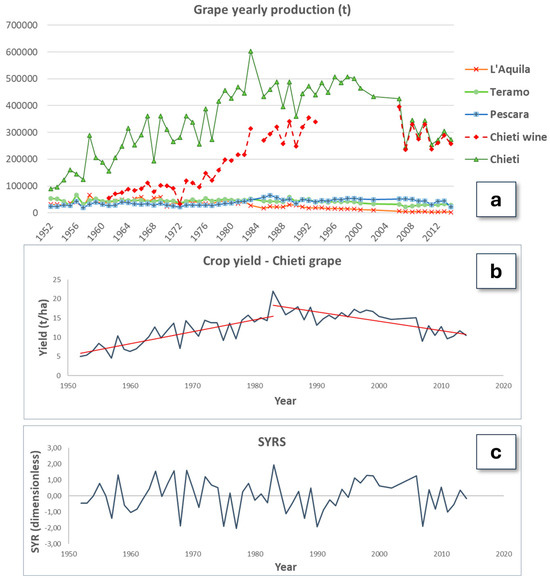 This study analyzed total grape production in the province of Chieti, encompassing both table and wine grapes. Figure 4a illustrates the total grape production (tons/hectare) in the four provinces of Abruzzo, highlighting the concentration of the overall regional production in the province of Chieti. Additionally, the dashed line represents wine grape production in Chieti. Despite being fragmented and discontinuous, data points highlight a significant increase in the production of higher-quality wine grapes over the studied period from 1952 to 2014. This production picture indicates that the province of Chieti has invested more heavily in intensive grape production compared to the provinces of L’Aquila, Teramo, and Pescara, where such production is secondary to other crops such as wheat or olive. For these reasons, our statistical analysis focused on production in the province of Chieti, where the grape production system demands a high level of performance.