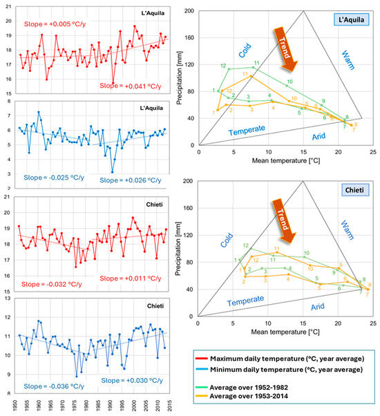 The climatic analysis revealed that daily maximum and minimum temperatures show a slow but statistically significant increasing trend (significance > 10%, according to the Mann–Kendall test [23]), in the second thirty-year period. Furthermore, the climate exhibits a systematic shift from temperate to temperate–arid. Figure 5 illustrates an example of maximum and minimum daily temperature (yearly average) trends and climate classification according to the Péguy criterion, with a related shift for the provinces of L’Aquila—in which the changes are more evident—and Chieti.