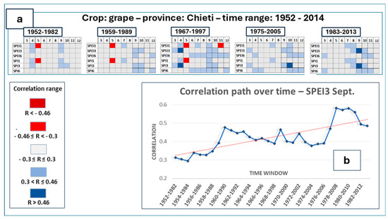 (a) Identified correlation coefficients between detrended crop yield (SYRS) and relevant SPI and SPEI indices for grape in the province of Chieti and for five sequential time windows. The correlation threshold (absolute) values of 0.3 and 0.46 are associated with a statistical significance of 10% and 1%, respectively. An increase in the number of colored cells, and mainly of dark red or blue ones, denotes a growing correlation between crop and climatic oscillations. (b) Correlation values between SYRS and SPEI3 of September, calculated in a time window of thirty years, sliding over the whole studied time range (1952–2014), with the trendline.