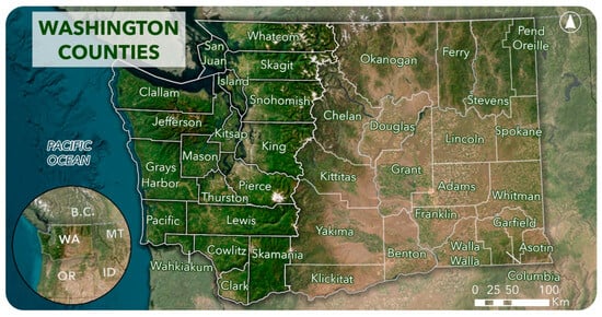 - Western Regional Climate Center. Climate of Washington. Available online: https://wrcc.dri.edu/Climate/narrative_wa.php (accessed on 14 January 2025).