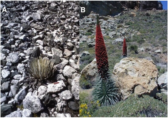 (A). Coespeletia timotensis (Cuatrec.) Cuatrec. (Asteraceae) growing on a steep talus slope of granite and amphibolitic schist fragments; stones are ~25–35 cm long, rosette is ~42 cm tall; pocket knife for scale is 8 cm long. Parque Nacional Sierra de La Culata, equatorial Venezuelan Andes, 4355 m. Photo: 26 December 1982. This is the rosette species that grows at highest elevations in the world [16,17]. (B). Echium wildpretii H. Pearson ex. Hook. f. (Boraginaceae), growing in Roques de García, a group of volcanic pinnacles at Parque Nacional del Teide, Tenerife, Spain. The largest individual in front is rooted at the base of a ~1.6 m tall volcanic boulder, produced by a large rockfall, visible on the upper left—slope angle is 19–21°; 2060 m. Photo: Teide-08, 28 May 2008. Note the ≤2.7 m tall inflorescence stalks; compare these with those in silverswords Figure 3). All ground photographs, except when otherwise indicated, were taken by the author.