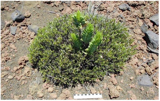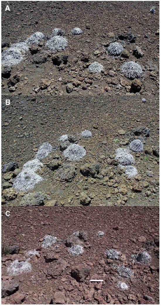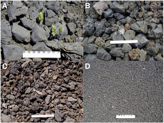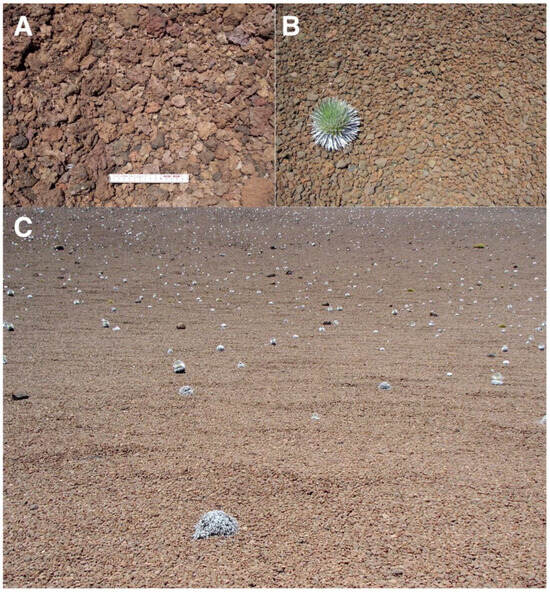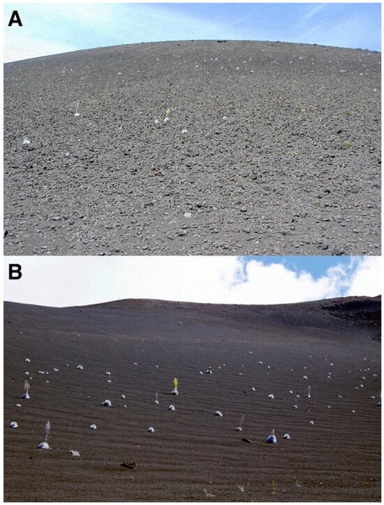 A sizable, gently sloping, area directly downslope from plot 1 is associated with a continuous mantle of mostly black to gray cinder, intermingled with spatter and ash; some rocks here developed in situ from the weathering of alkali olivine basalt lava flows, but many of the angular, medium- to small-size clasts on this section were also derived from the large taluses above through downhill gravitational migration and water transport of fine soil material (Figure 11B); a wide, dense band of native grasses (Deschampsia nubigena and Trisetum glomeratum) across the basal talus clearly marks the point where subsoil water comes near the slope surface above this black tephra accumulation area. A few large, scattered breadcrust bombs, showing surface shrinkage cracks on their surface [44,45], are also present here. A surficial (≤10 cm thick) layer of scoriaceous tephra overlies deep (≥95-cm) coarse, gravelly sandy Vitrandic Haplustept soils with a low organic matter content [104]. Yet, despite the pervasive presence of thick soils, not a single adult rosette or seedling can be found in this extensive, ~8–10-Ha expanse (Figure 11B).