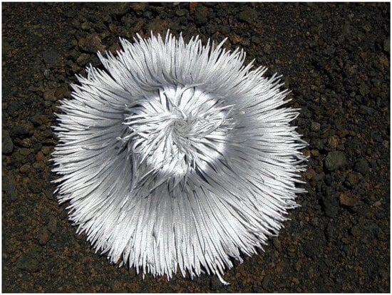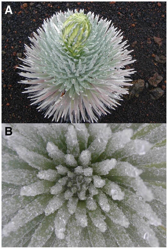 The Haleakalā silversword (Argyroxiphium sandwicense DC. subsp. macrocephalum (A. Gray) Meyrat)—’āhinahina in Hawaiian—is the most impressive plant found in Haleakalā National Park [HNP]. This giant, perennial, monocaulic (single-stemmed), rarely branched, rosette-plant has a short, ≤8 cm diameter woody stem that ends in a large (≤1 m diameter), dense crown of silvery, shiny, evergreen, long, narrow, sword-shaped, densely pubescent, floccose-silky leaves; the older, dry, shriveled, marcescent, 15–40 cm long leaves remain strongly attached to the stem until they finally decompose [31]. The silversword is dioecious and monocarpic and dies after flowering just once at the end of its life, perhaps after 39 to 63 years—although some individuals may survive nearly 90 years [32]—when the plant initiates bolting, and grows a spectacular, up to 250 cm long, flowering stalk with ~50–600 purple flower heads (Figure 3). An important characteristic of the silversword—relevant to this story—is that the shiny, light color and hair cover on its leaves confer it an unusually high degree of reflectance, i.e., high albedo (Figure 4).