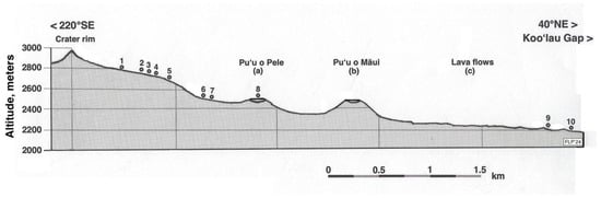 Schematic topographic section along a 220° SE–40° NE azimuthal direction, showing the 10 temperature measurement plots, arranged by altitude (m) as numbered dots. Plots and cinder cones located along the 5 km long transect were laterally projected on a cross-section plane; scale is in km. Data were from base map, kindly allowed by U.S. Geological Survey: USGS Map I-1088 (1:24,000), Miscellaneous Investigations Series. Geologic map of the crater section of Haleakala National Park, Maui, Hawai’i, Gordon A. Macdonald, 1978 [59]. USGS is located at https://usgs.gov, accessed on 12 May 2015. Compared with a recent satellite photograph (Figure 6).