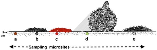 Different substrate microsites sampled. Key: (a): bare soil, (b): black tephra, (c): reddish tephra, (d): shaded ground next to a silversword rosette, (e): dead silversword organic matter. All temperatures were measured at 5 cm depth within the soil.