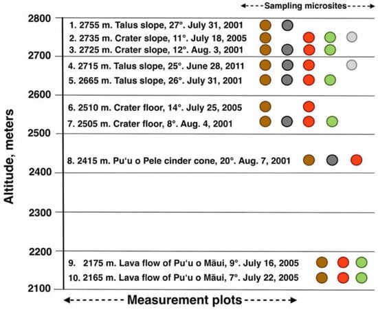 Fieldwork encompassed 19 years, from 1996 to 2014; ten summer field seasons included extensive reconnaissance of potential research sites in the western and central parts of Haleakalā Crater, during which a diversity of tephra environments and geomorphic sites was explored across the volcanic depression. Substrate temperature data sets—see below—were gathered at ten extensive study parcels, henceforth called measurement plots; thermal data were obtained at each plot during a single, sunny, cloud-free, clear-sky, warm, day, close to noon, during summer months (June, July, or August) between 2001 and 2011. Plots were located between 2165 and 2755 m; this elevation range encompasses most of the whole natural altitudinal span of the silversword (Figure 5 and Figure 6). Individual plots varied in area from ~100 to ≤500 m2; plots were consecutively numbered starting from the highest elevation and exhibited a NE aspect, except plot 8 inside Pu’u o Pele’s crater, a large cinder cone, which had a SE orientation. Plot altitude was assessed with a Thommen™ (Thommen, Muttenz, Switzerland) altimeter—expected error of ±10 m—and later verified on USGS topographic maps. Average slope inclination was determined with a Suunto™ (Suunto, Vantaa, Finland) clinometer; mean plot azimuthal orientation was measured with a geological Brunton™ (Brunton, Riverton, WY, USA) compass. Prior to sampling, plots were carefully examined to identify potential locations where readings for different substrate types could be obtained on closely adjacent positions. Data collection was designed afterward to compare consecutive readings of soil temperatures in contiguous (~100- to ~250 cm apart) locations, called sampling microsites here.