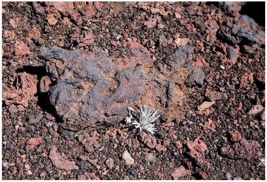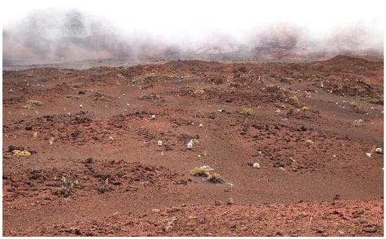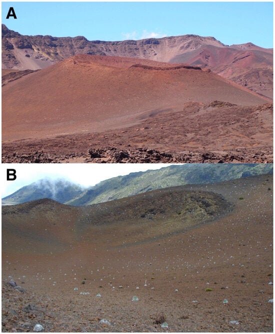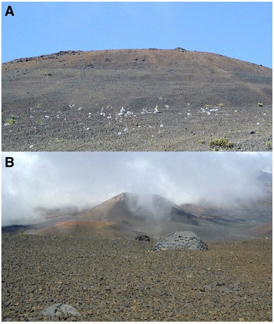 (Figure 14B) Isolated small spots on the predominately reddish tephra flow from Pu’u o Māui display a uniform cover of black, clinkery, sharp, jagged-edge clasts with abundant small vesicles mixed with some reddish fragments derived from the lava flow (Figure 14C) (Table 1). South of Pu’u o Māui, an extensive, nearly level area, mantled by fine black cinder and lapilli, extends to the SW for more than 1.4 km; this plain is totally devoid of silverswords or any other vegetation, except for an unusual small patch of biological moss crusts near the cone’s base [78,88]; these very fine volcanic sediments were presumably deposited on this area during Pu’u o Māui’s eruptions 1500–3000 BP, as the NE trade winds blew fine pyroclastic materials in this direction (Figure 14D).