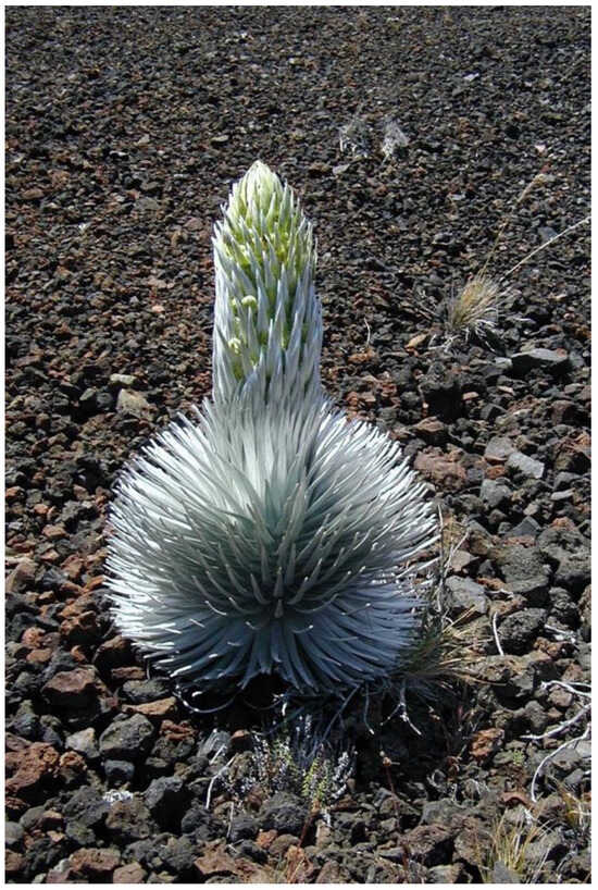 - Powell, E. Recovery Plan for the Mauna Kea Silversword (Argyroxiphium sandwicense DC. ssp. sandwicense); U.S. Fish and Wildlife Service, Pacific Region: Portland, OR, USA, 1994; pp. 1–44. [Google Scholar]