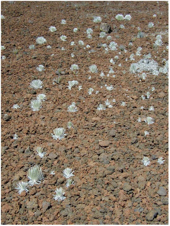 Across the lower crater, and all the way to the Silversword Loop, the vast red alkali olivine basalt ‘a’ā lava flows originating from Pu’u o Māui are largely covered by cinder and ash deposits of comparable composition to that of the cinder cone that released them; large portions of the cone were actually violently detached from it and rafted >2 km toward the Ko’olau Gap [59]. The intensely red deposits display multiple flow ridges, chiefly occupied by extensive basalt outcrops, with shallow intervenient troughs covered by ash and small tephra fragments (Figure 18). Rosettes on this lava flow grow primarily on rocky protrusions, coarse tephra, finer-debris areas next to nurse rocks, or thin soils over shallow bedrock [91].