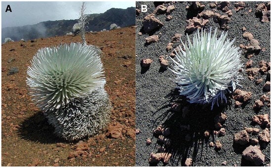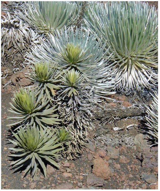- Pérez, F.L. Influence of substrate on the distribution of the Hawaiian silversword (Argyroxiphium sandwicense DC.) in Haleakala (Maui, HI). Geomorphology 2003, 55, 173–202. [Google Scholar] [CrossRef]