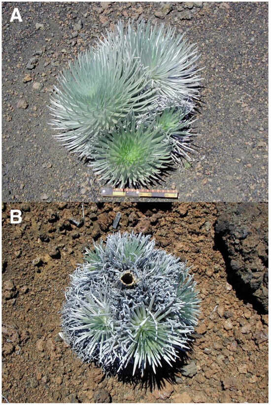 - Loope, L.L.; Crivellone, C.F. Status of the Haleakala Silversword: Past and Present; Technical Report; Cooperative National Park Resources Studies Unit, Hawai’i, CNPRSU-58 University of Hawaii: Honolulu, HI, USA, 1986. [Google Scholar]