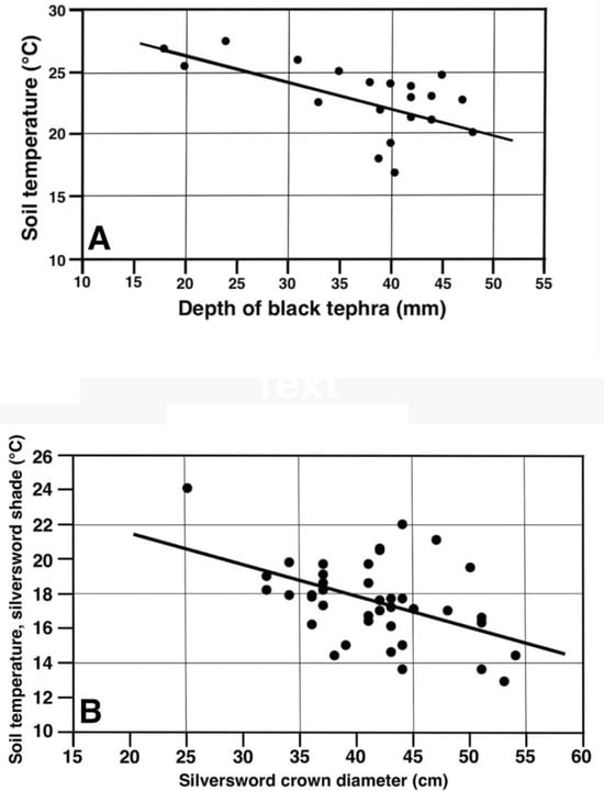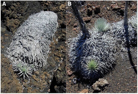 Any reduction in substrate temperatures would be of great ecological significance for the establishment and survival of silversword seedlings. Laboratory experiments using Argyroxiphium seeds from Haleakalā, as well as from Mauna Loa (island of Hawai’i) [56], indicated that seeds were extremely sensitive to high temperatures and failed to germinate after only 8 h of exposure to a soil temperature of 35 °C; brief exposure periods of just 15 min to temperatures of 60 °C sufficed to kill all seeds. Laboratory and fieldwork research also showed that silverswords from Mauna Kea had a greater germination percentage, faster growth rates, and lower mortality in tephra-covered areas than on bare soils [57,58].