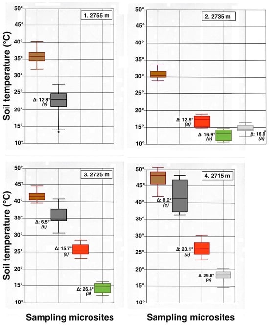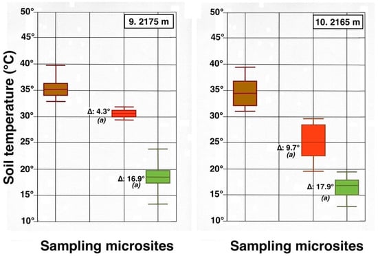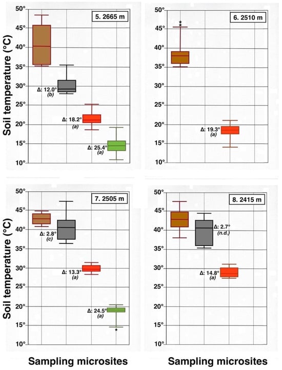 Soil temperatures for all sampled microsites were thoroughly evaluated, graphically and statistically, with Exploratory Data Analysis (EDA) [64,65,66,67,68]. EDA consists of a variety of visual and quantitative methods but, undoubtedly, the most valuable and often utilized tool in EDA are parallel box plots [67,68]. This powerful analytical technique was originally developed by John Wilder Tukey in 1970 [69]; among other concerns, Tukey considered histograms ‘old-fashioned’ and thought they were unable to adequately portray complex statistical data sets; thus, he devised box plots as a means of showing on a single summary graph several continuous data sets. Since then, box plots have proven extremely useful in the evaluation of voluminous data and for allowing comparisons across samples to help in the development of hypotheses [70]. Box plots can plainly portray the overall data range, the numerical extremes, and a measure of central tendency—usually the median—of a data population, thus providing immediate visual assessment of data dispersion [71]; they are particularly useful for indicating general sample symmetry of data distribution, showing whether a statistical distribution is skewed, and if there are unusual observations or presence of potential outliers within it. Box plots are non-parametric and—in contrast to histograms, which require a sample size of at least 30 to be useful—need only a minimum sample size of 5 and can also contain an unequal number of observations; box plots also provide more detail in the distribution tails and are easily compared across 3 or more sample data sets [72,73]. In fact, box plots may facilitate the identification of underlying patterns, relationships, and trends between data samples that might be concealed within unequal-size populations of numbers [74,75].