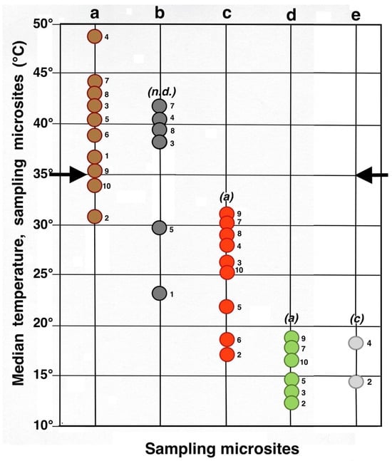 All days chosen for sampling were remarkably sunny and very warm. Air temperatures varied from 22.8 °C (plot 3) to 32.8 °C (plot 8), median temperature was 29.5 °C; RH fluctuated from 22% (plot 7) to 47% (plots 8 and 9), with a median value of 30%. Records of daily ground temperatures revealed substantial differences, not only among the four sheltered microsite types analyzed, but also between all locations and adjacent bare soil areas (Table 2). Temperature data are graphically summarized in 10 detailed box plot diagrams (Figure 23, Figure 24 and Figure 25); temperatures discussed below are median values. Undoubtedly, thermoprobe measurements, obtained on different calendar days, were not strictly comparable, and several factors, including minor color variance of soils and tephra, plot orientation, slope gradient, solar angle, amount of cloud cover, air temperature, and precise time of measurement, introduced some degree of variation to the thermal records (see Table 1).