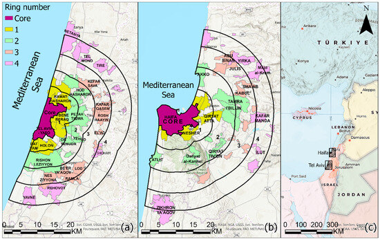 (a) The Tel Aviv-Jaffa metropolitan region in central Israel; (b) the Haifa metropolitan region in Northern Israel. The two regions are divided into five sub-regions: a core and an additional four concentric rings (labeled 1–4). (c) An overview map of the two metropolitan regions. The maps are projected in the Israel Transverse Mercator coordinate system with the WGS84 datum.
