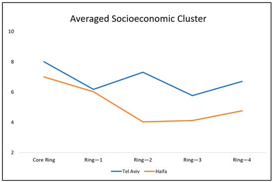 The average number of socioeconomic clusters in each ring in Tel Aviv-Jaffa and Haifa metropolitan. Accordingly, the Tel Aviv-Jaffa core is attributed with a socioeconomic cluster of 8, while rings 3 and 4 have values of 6 and 7, respectively. The Haifa core, on the other hand, is attributed with a socioeconomic cluster level of 7, while rings 3 and 4 are 4 and 5, respectively.