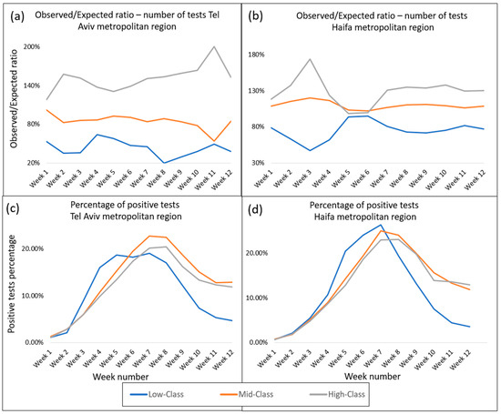The phenomenon by which low socioeconomic groups tend to be tested less can be seen also when examining the data associated with the Tel Aviv-Jaffa and Haifa metropolitan regions (Figure 3). In the Tel Aviv-Jaffa region, the ratio between the observed and expected COVID-19 tests differ significantly between the low-class and high-class groups. The former was tested 40–80% less than expected (a ratio of 0.2–0.6), while the latter was tested 30–90% more than expected (a ratio of 1.3–1.9). The gap between the two ratios remains large throughout the entire period (Figure 3a). In the Haifa region, the ratio between the observed and expected COVID-19 tests varies significantly between the low-class group and the high-class group (Figure 3b). In the first three weeks of the wave, the ratio in the high-class group ranged between 1.18 and 1.47, that is, about 18–74% tests more than expected. The ratio in the low-class group was between 0.79 and 0.47, that is, 21–53% tests less than expected. In weeks 4–5, the gap between these groups was almost equal, where both groups were tested between 2% and 6% less than expected. In week 6–7, the ratios reverted to the initial state, where the high-class group was tested about 30% more than expected, while the low-class group was tested about 20% less than expected.
